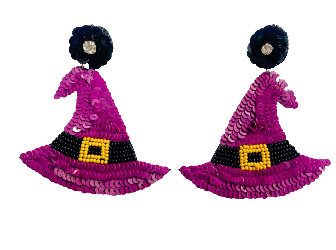 How cute are these Witch Hats? Super fun and festive to wear for Halloween Season. Embellished with purple and black sequins with a small rhinestone detail!